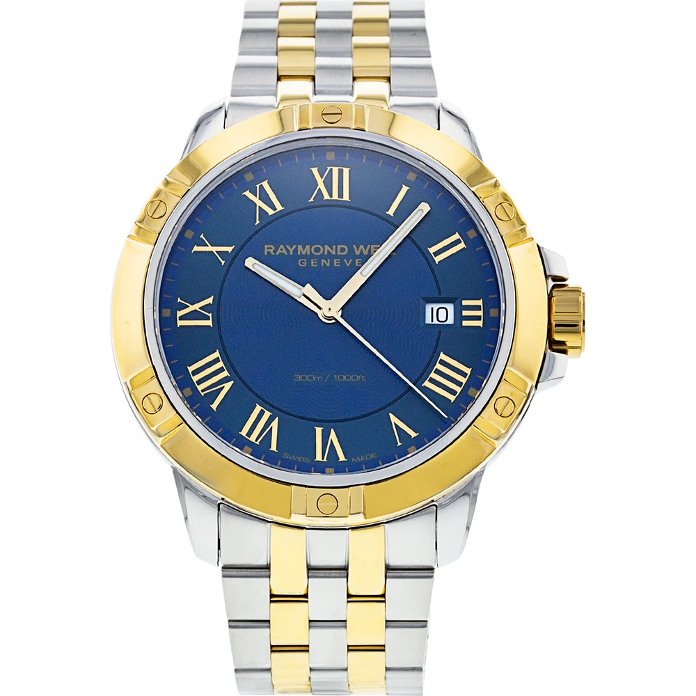 This Raymond Weil watch has a stainless steel case 41 mm in diameter and is fitted with a metal strap. Inside the case lies a ETA movement and the watch features a Sapphire crystal.