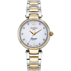 This Roamer watch has a case made of stainless steel with a diameter of 33 mm and is fitted with a metal band. Inside the case lies a Ronda movement and the watch features a Sapphire crystal.