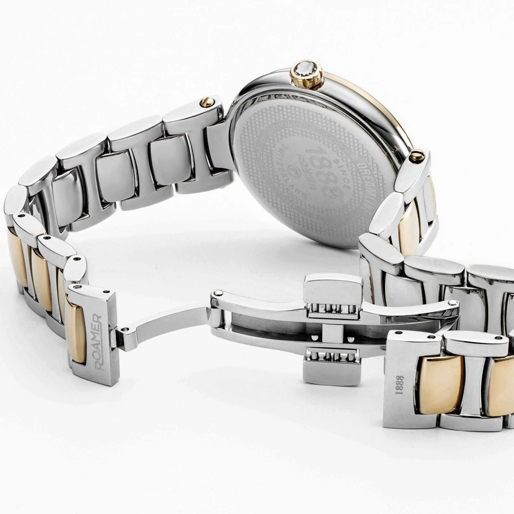 The watch is 5 ATM. This means the watch is suitable for showering. The watch comes with Roamer 2+5.