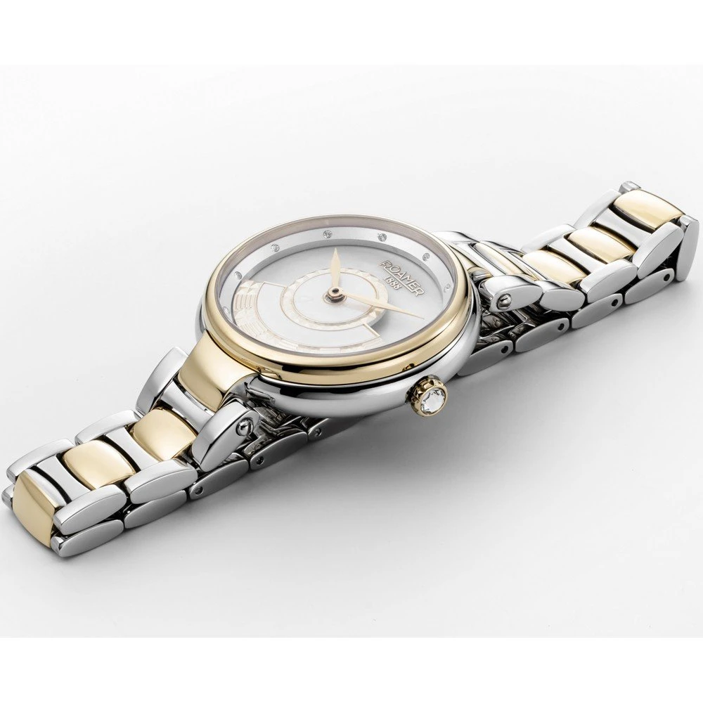 This Roamer watch has a case made of stainless steel with a diameter of 36 mm and is fitted with a metal band. Inside the case lies a Ronda movement and the watch features a Sapphire crystal.