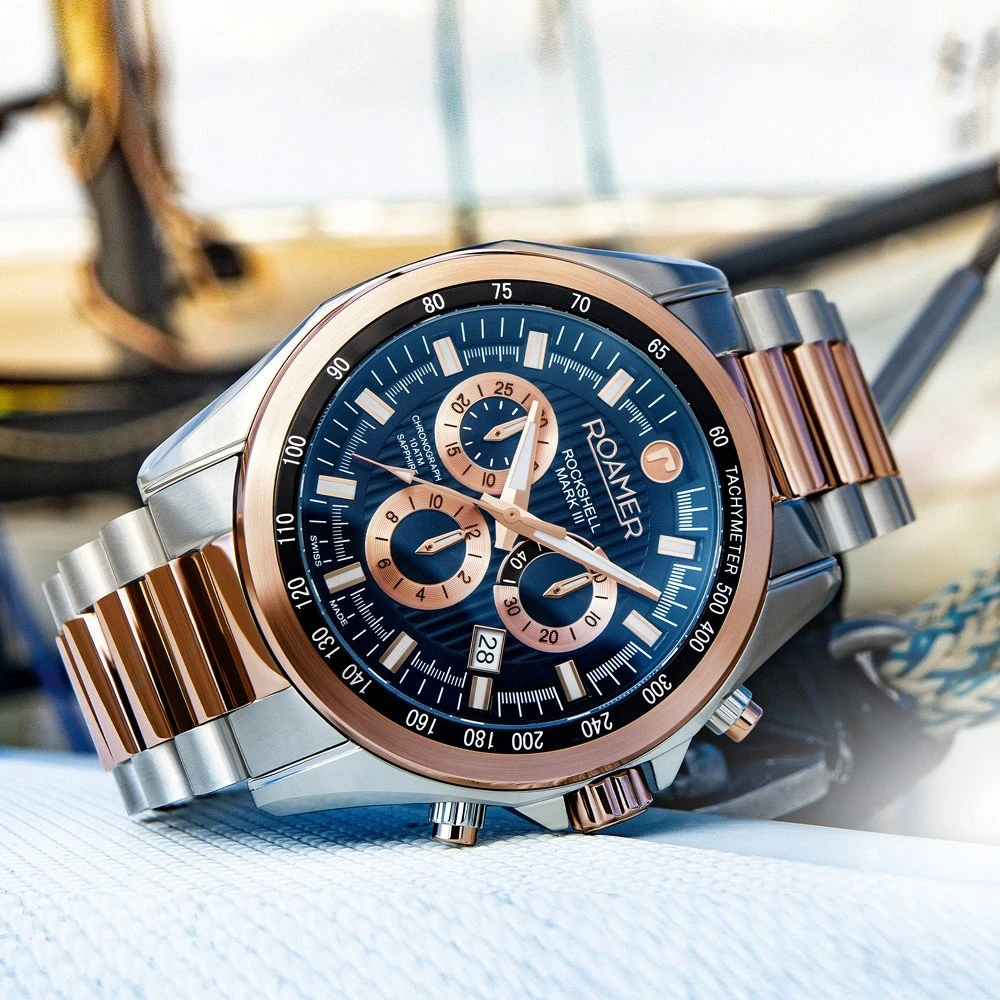 The watch is 10 ATM. This means the watch is suitable for swimming. The watch comes with Roamer 2+5.