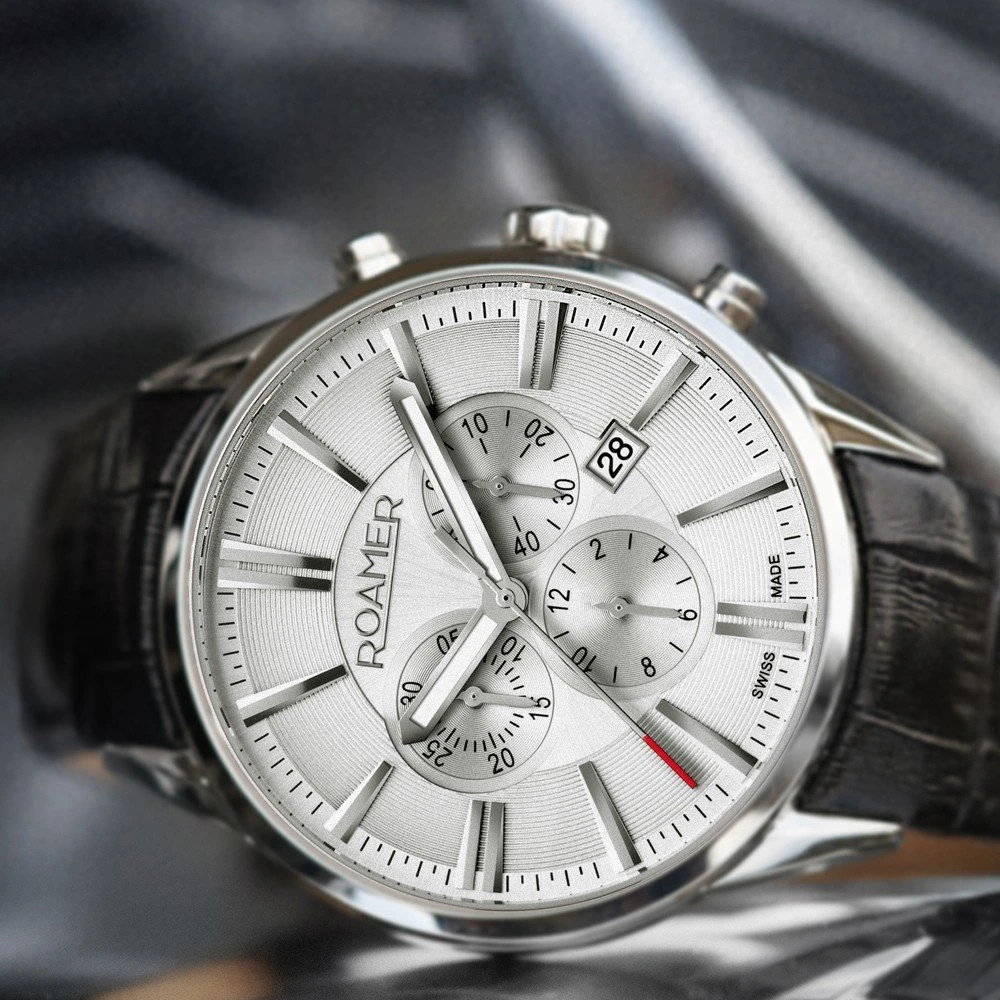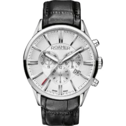 This Roamer watch has a case made of stainless steel with a diameter of 44 mm and is fitted with a leather band. Inside the case lies a Ronda movement and the watch features a Sapphire crystal.