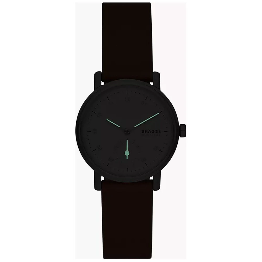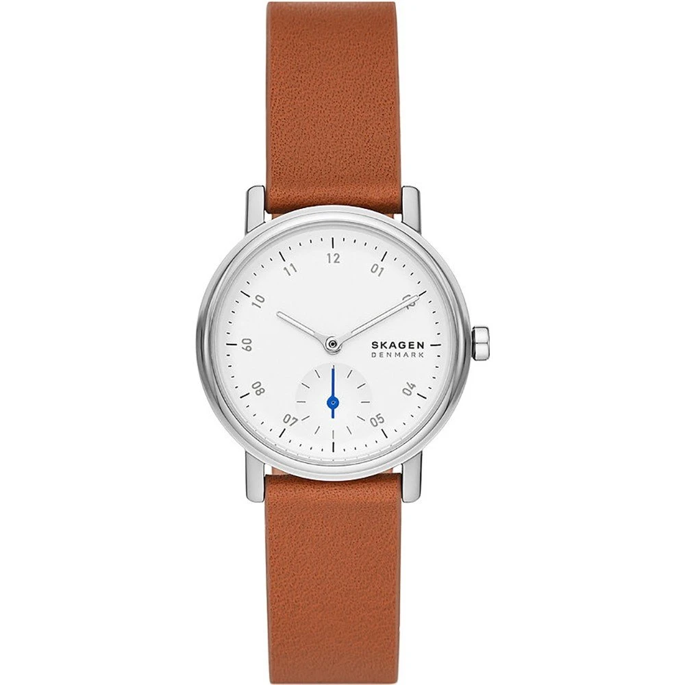 This Skagen watch has a case made of stainless steel with a diameter of 32 mm and is fitted with a leather band. Inside the case lies a Miyota movement and the watch features a Mineral crystal.