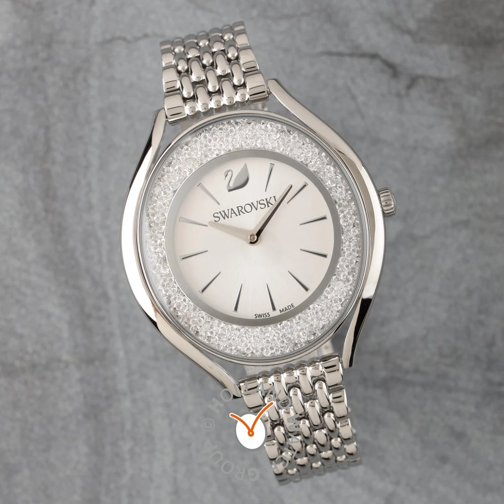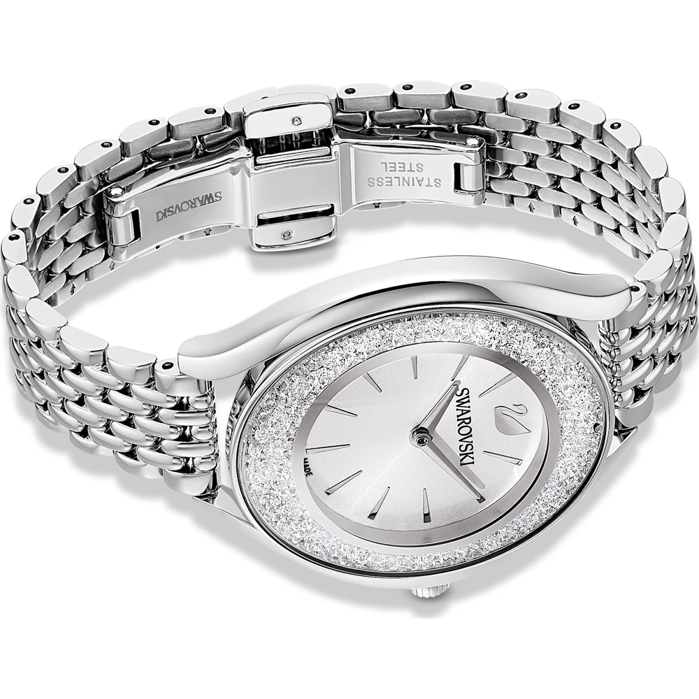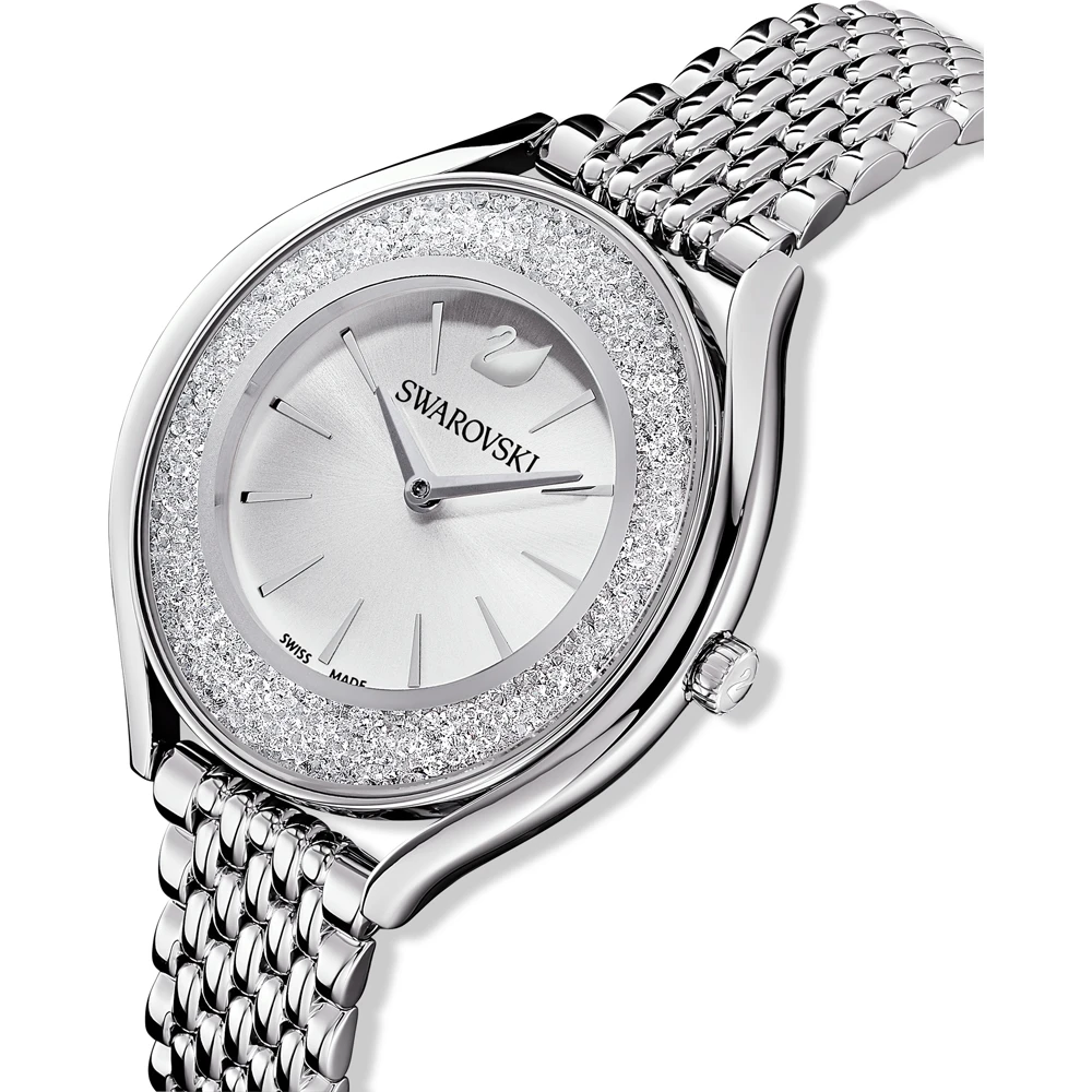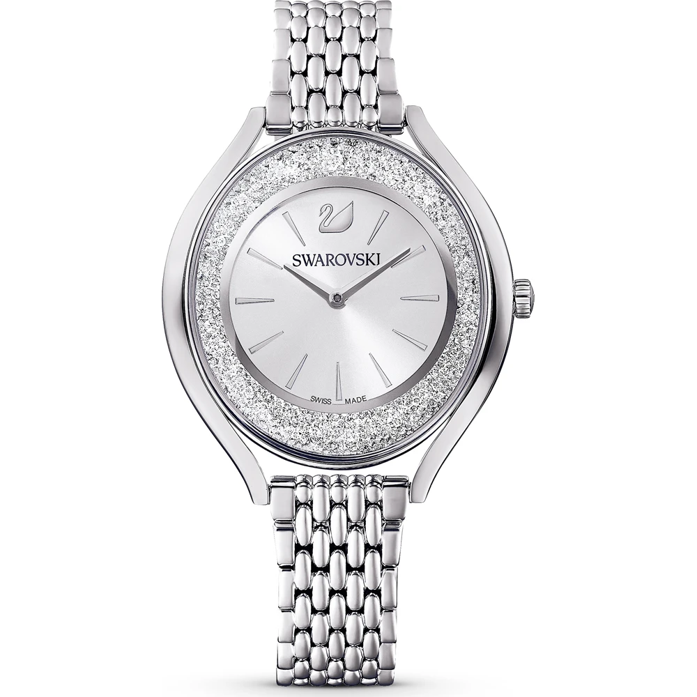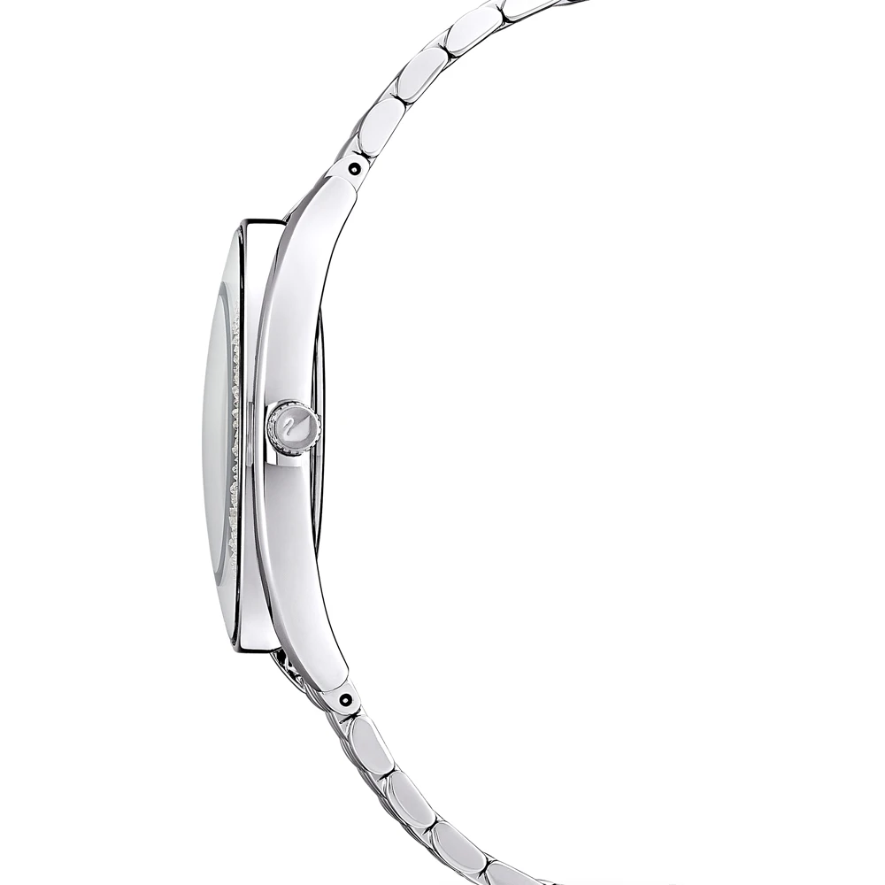 This Swarovski watch has a case made of stainless steel with a diameter of 35.5 mm and is fitted with a metal band. Inside the case lies a Ronda movement and the watch features a Mineral crystal.