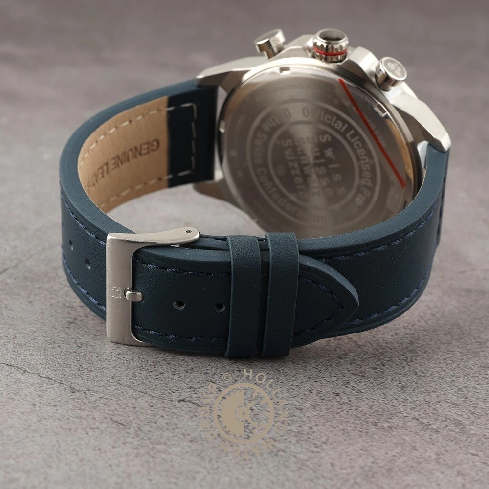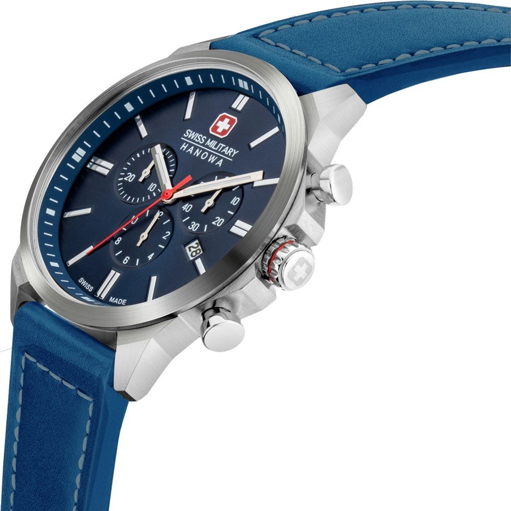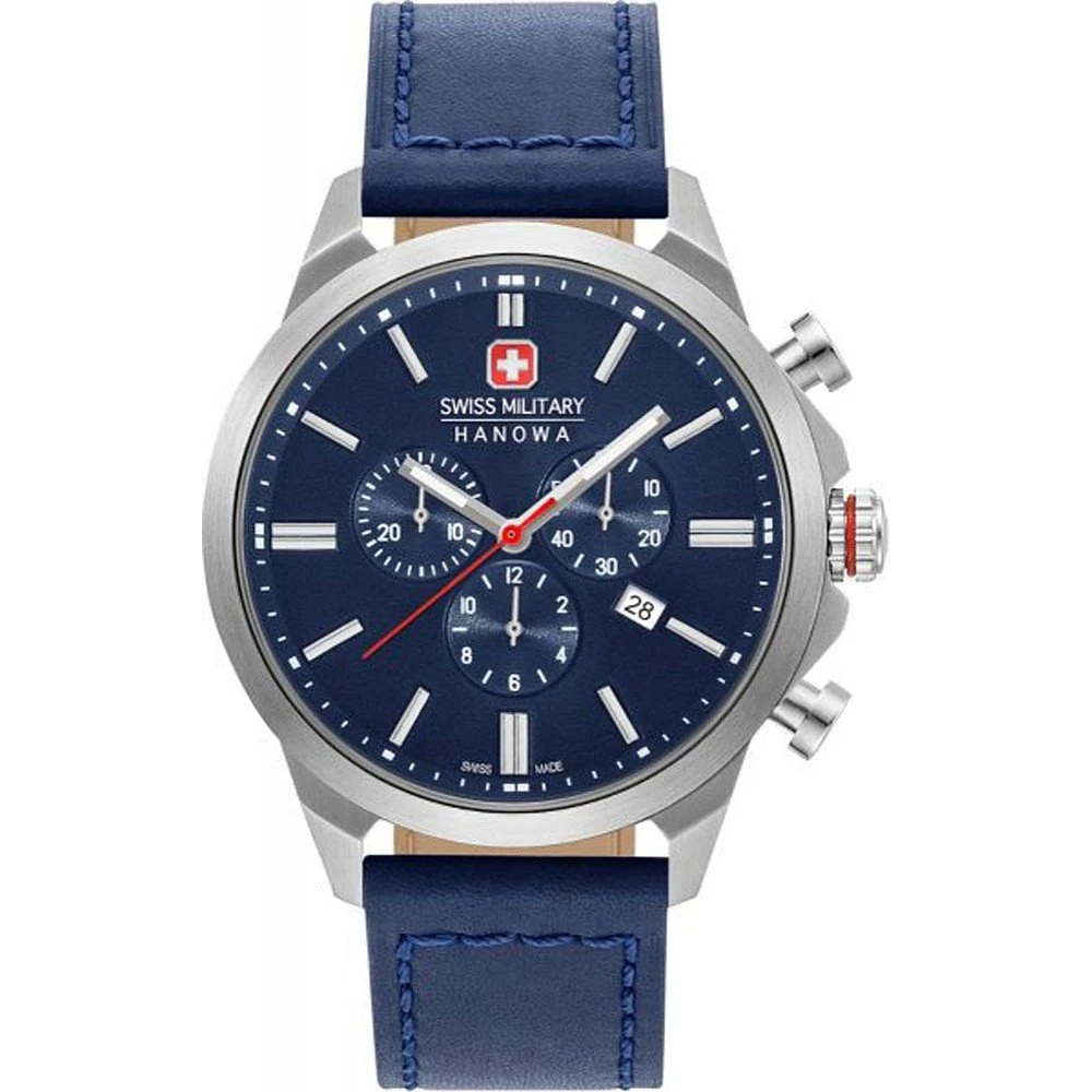 This Swiss Military Hanowa watch has a case made of stainless steel with a diameter of 45 mm and is fitted with a leather band. Inside the case lies a Ronda movement and the watch features a Sapphire crystal.