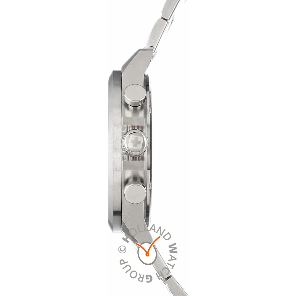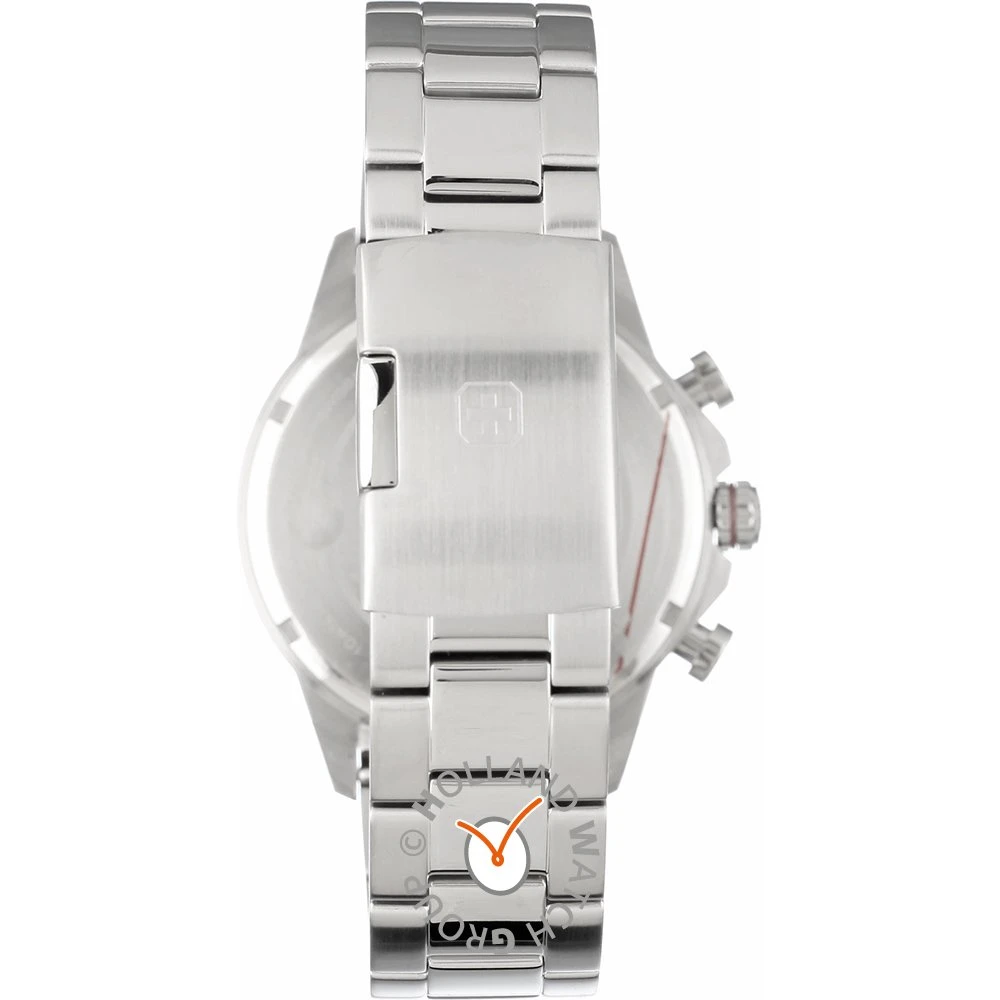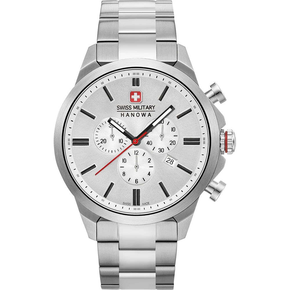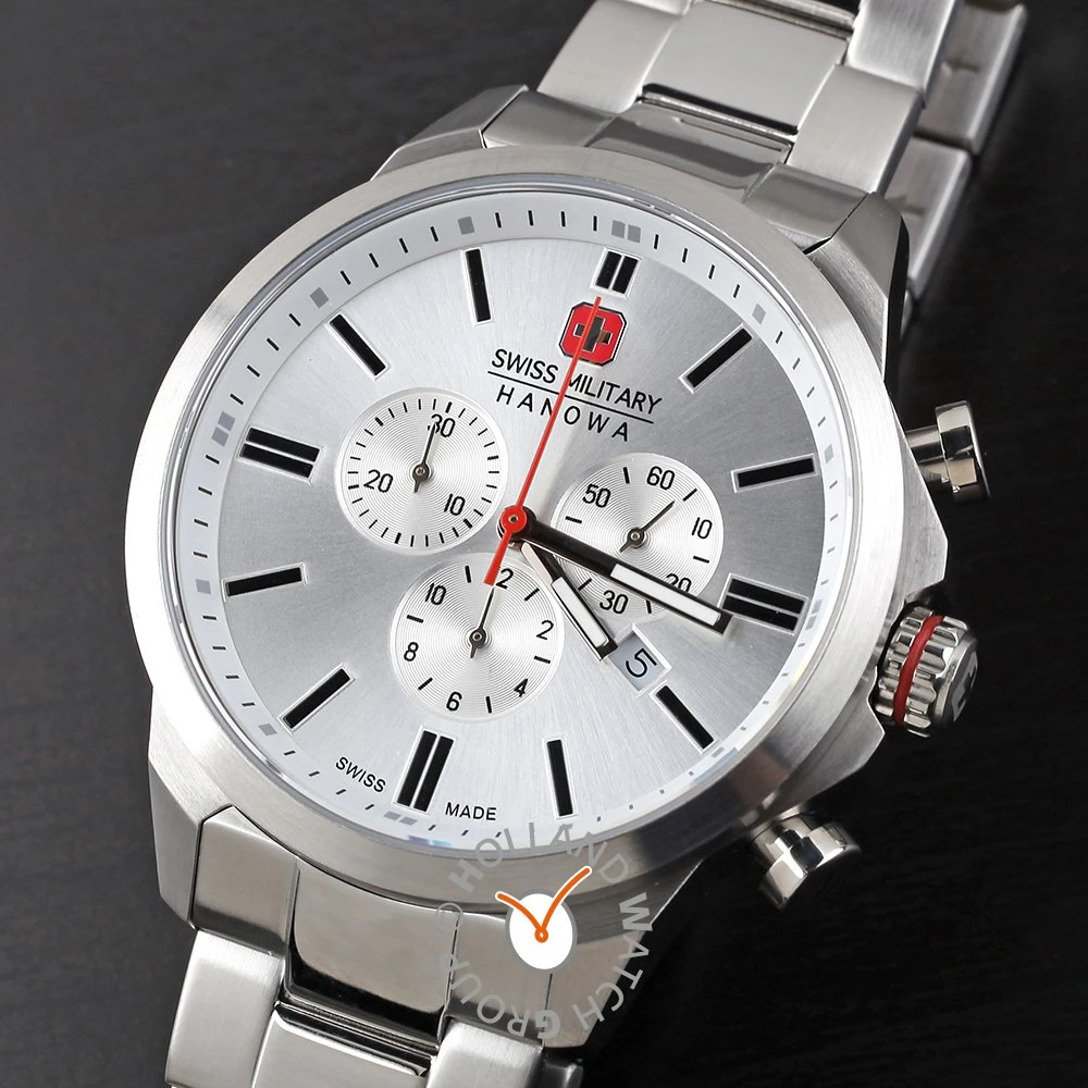 This Swiss Military Hanowa watch has a case made of stainless steel with a diameter of 45 mm and is fitted with a metal band. Inside the case lies a Ronda movement and the watch features a Sapphire crystal.