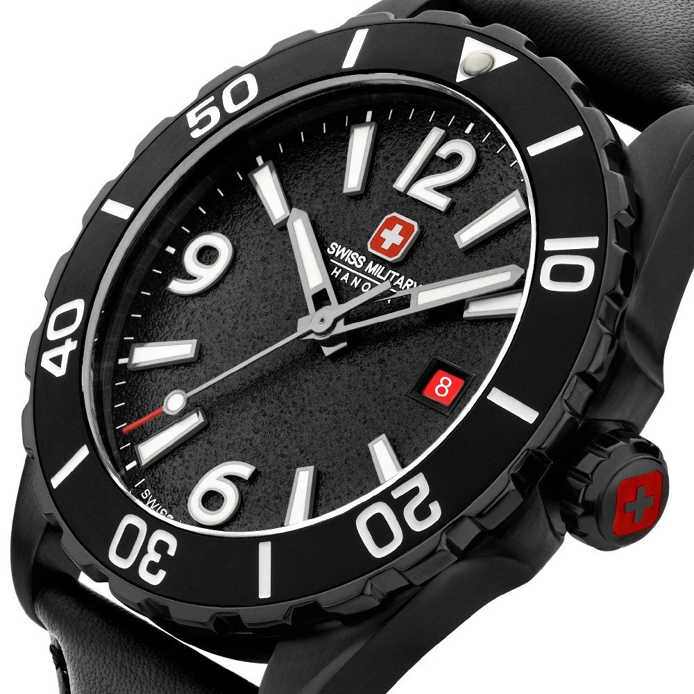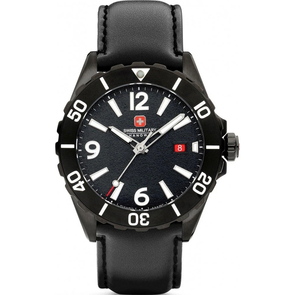 This Swiss Military Hanowa watch has a case made of stainless steel with a diameter of 44 mm and is fitted with a leather band. Inside the case lies a Ronda movement and the watch features a Sapphire crystal.