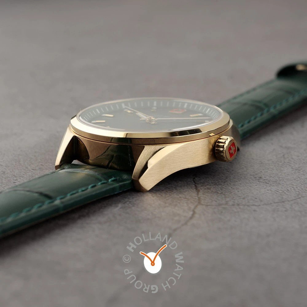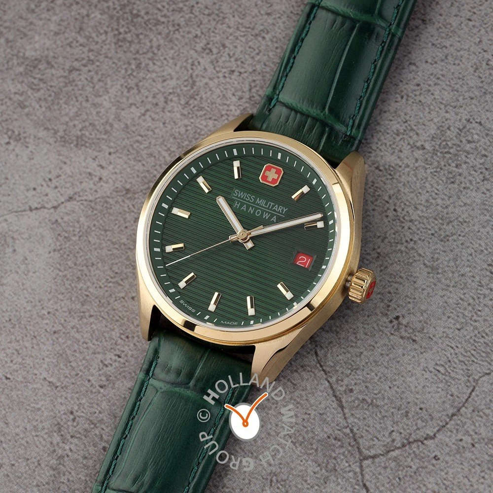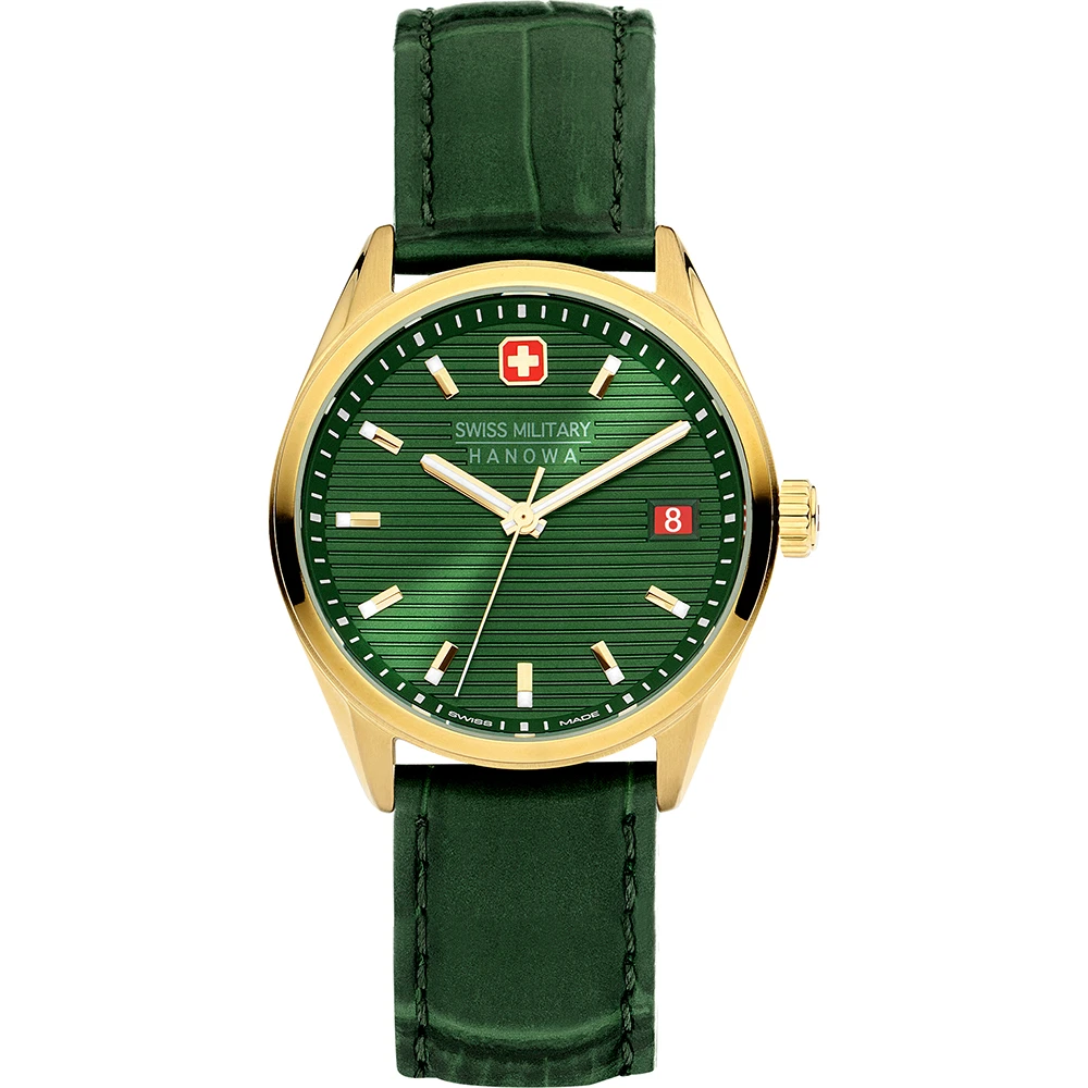 This Swiss Military Hanowa watch has a case made of stainless steel with a diameter of 35 mm and is fitted with a leather band. Inside the case lies a Ronda movement and the watch features a Sapphire crystal.