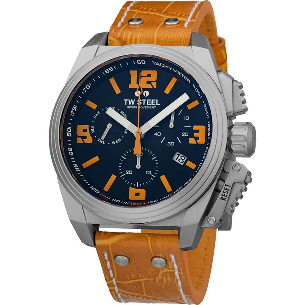 This TW Steel watch has a case made of stainless steel with a diameter of 46 mm and is fitted with a leather band. Inside the case lies a Ronda movement and the watch features a Single anti-reflective sapphire crystal.