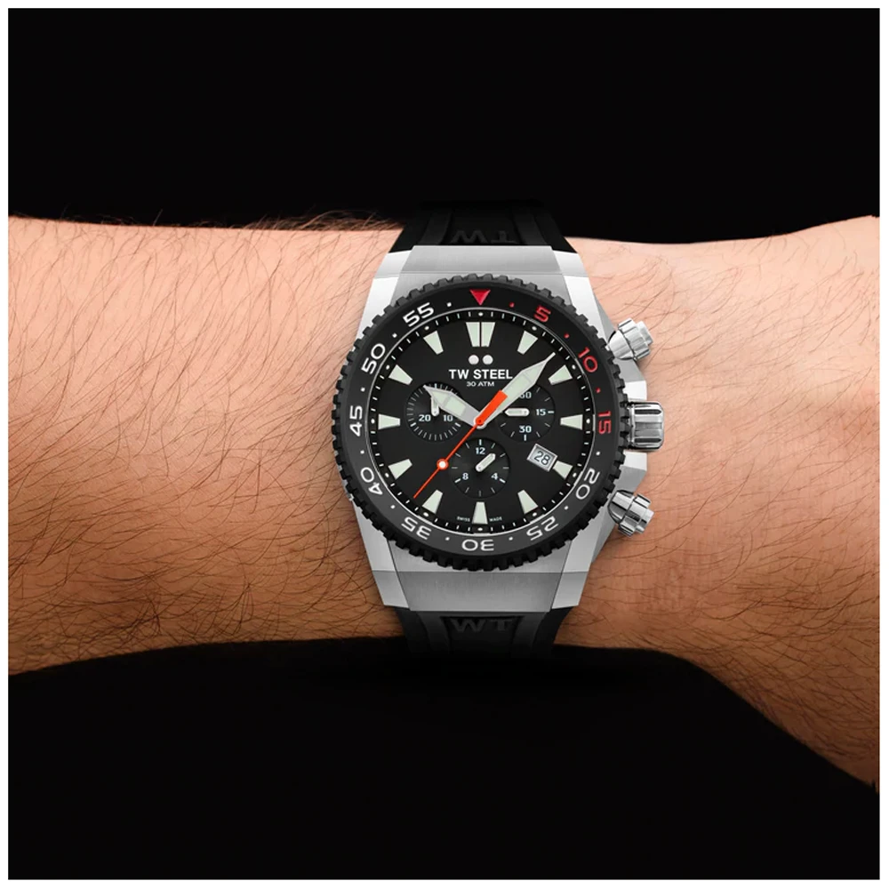 This Swiss Made limited to 1000 edition ACE401 diving chronograph is no less than 30 ATM water resistant. Powered by a Ronda 5030.D movement this watch does not offer accuracy alone, but is also sturdy and efficient. The applied indices and silver hands, both featuring Super Luminova contrast sharply with the red second hand and red accents on the bearing-mounted uni-directional bezel. To top it all off, the ACE401 comes with a five year warranty!