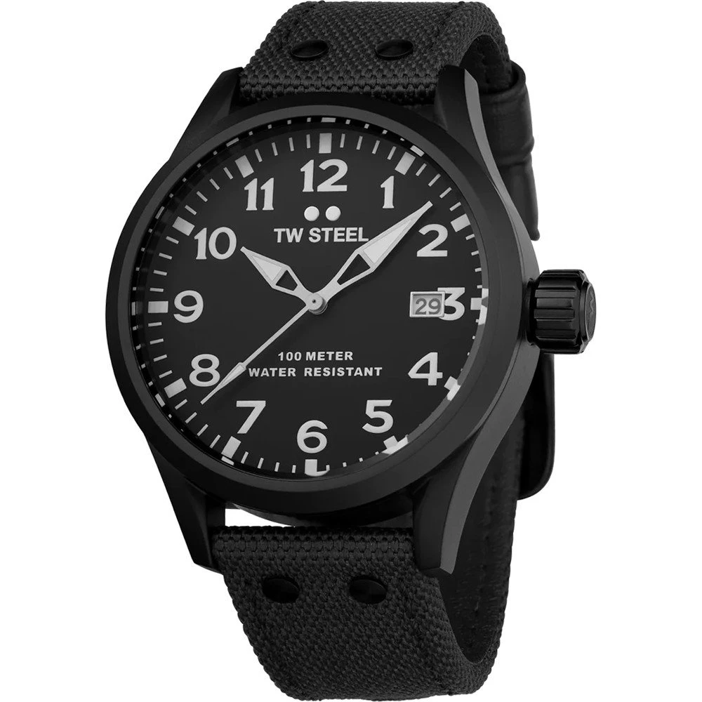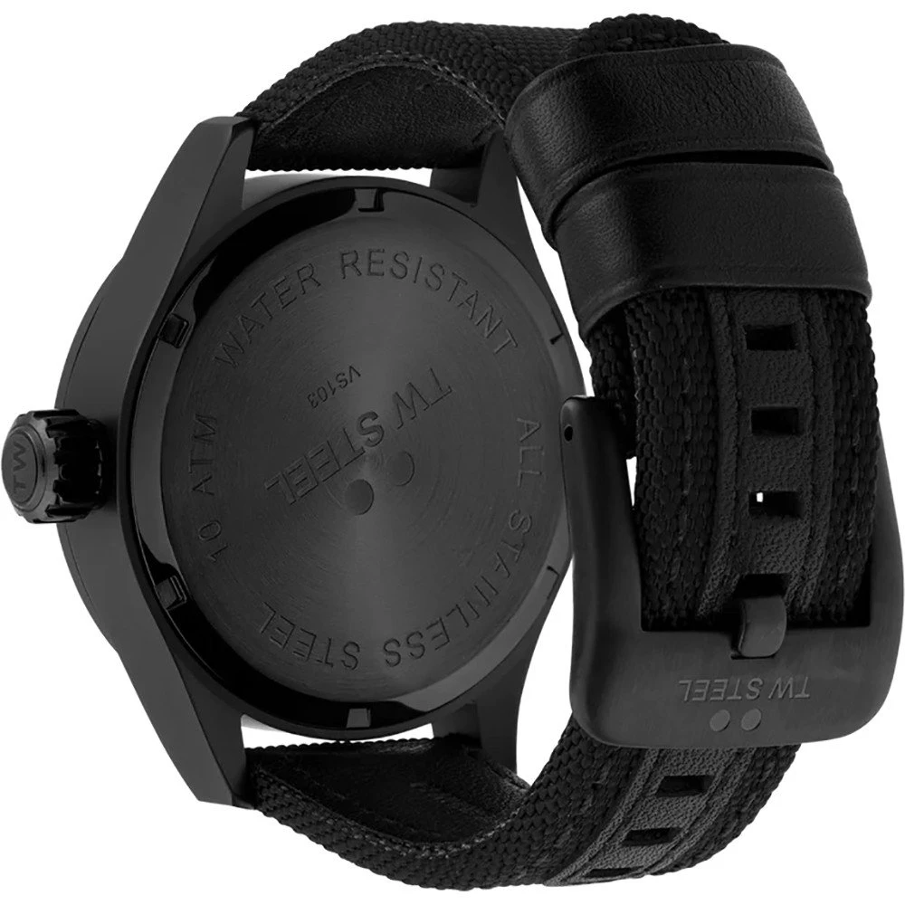 This TW Steel watch has a case made of stainless steel with a diameter of 45 mm and is fitted with a Textile over leather band. Inside the case lies a Miyota movement and the watch features a Mineral crystal.